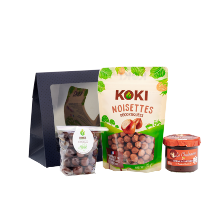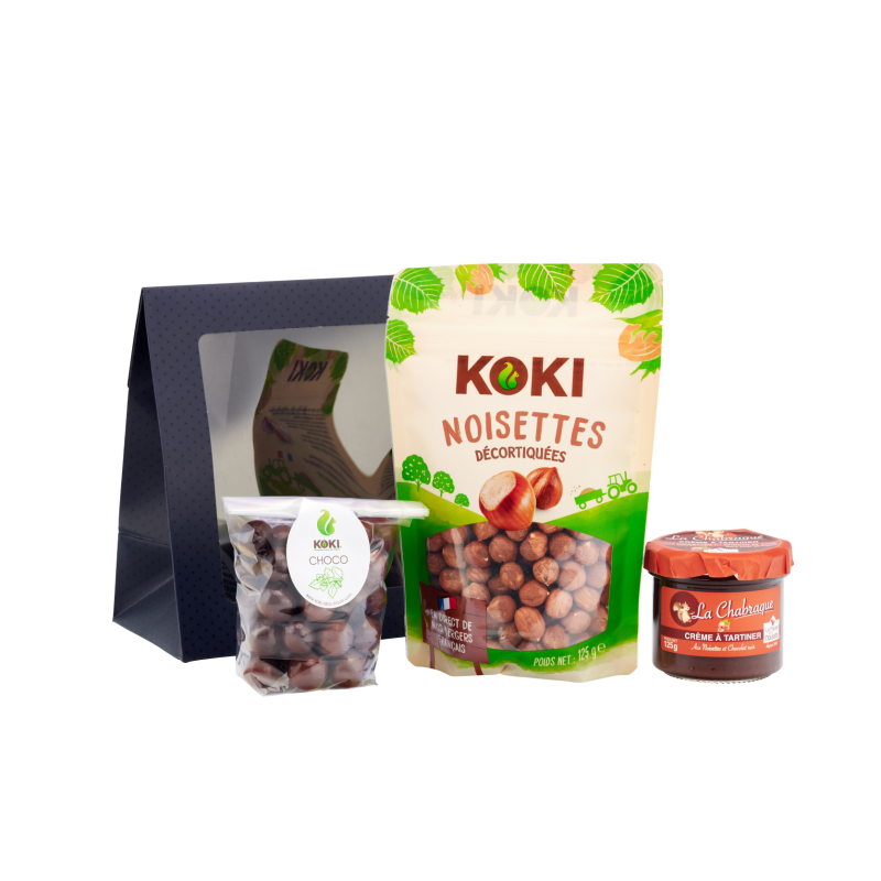 C offert dégustation à base de spécialités noisettes comprenant : chabraque lait 100g, un sachet de noisettes décortiquées 125g, et un sachet de délicieuses kokichoco 125g.