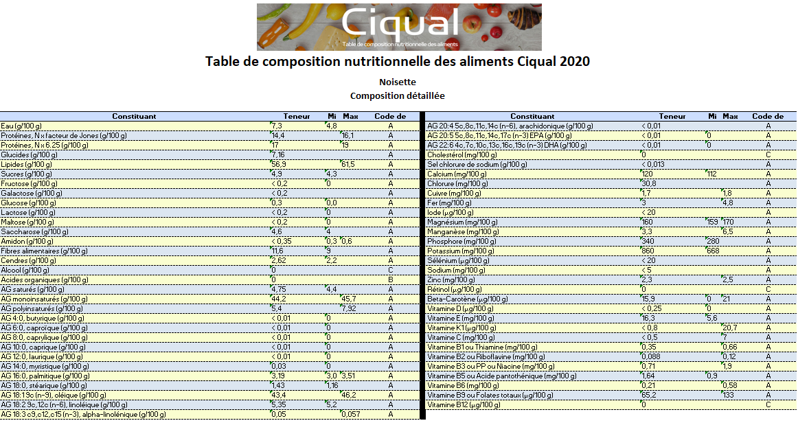 Tableau nutritionnel noisettes